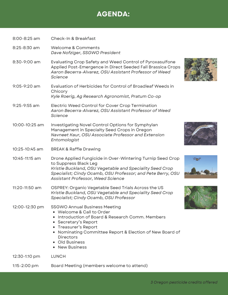 SSGWO provides education opportunities for growers, industry representatives, and other interested parties to further their knowledge of production, handling, quality, and other issues or topics related to specialty seed crops. Researchers whose projects were funded by SSGWO present their findings at the annual member meeting.